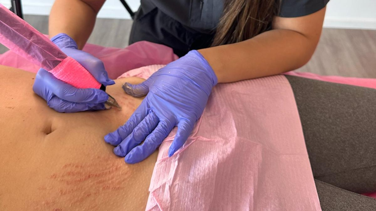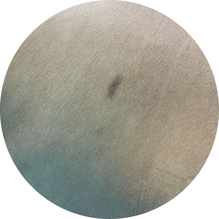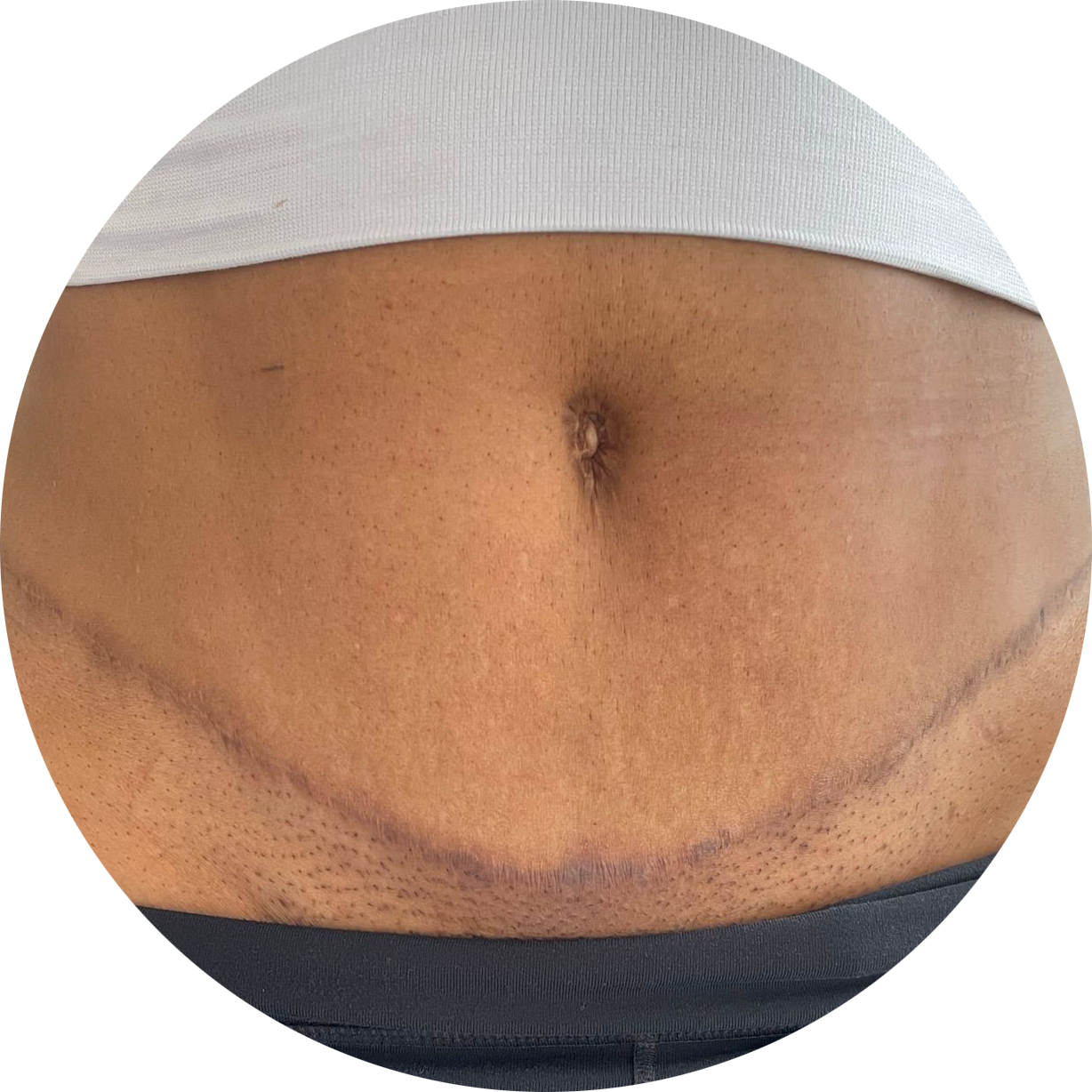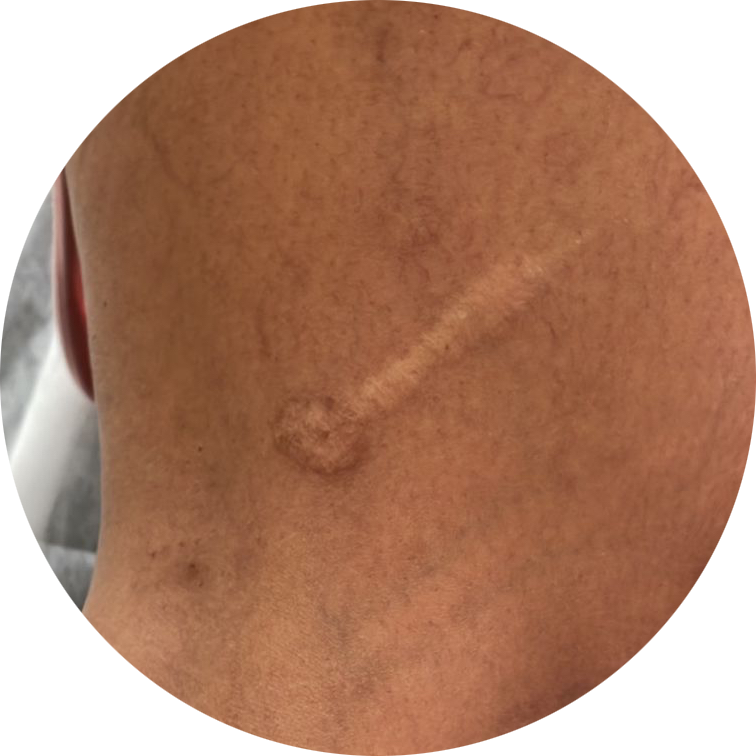 Reference: A medium area might include a larger surgical scar, multiple smaller stretch marks grouped together, or a moderate-sized stretch mark on the thigh or abdomen.